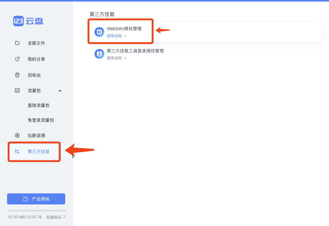 第二步:点击左侧第三方挂载,点击webdav授权管理