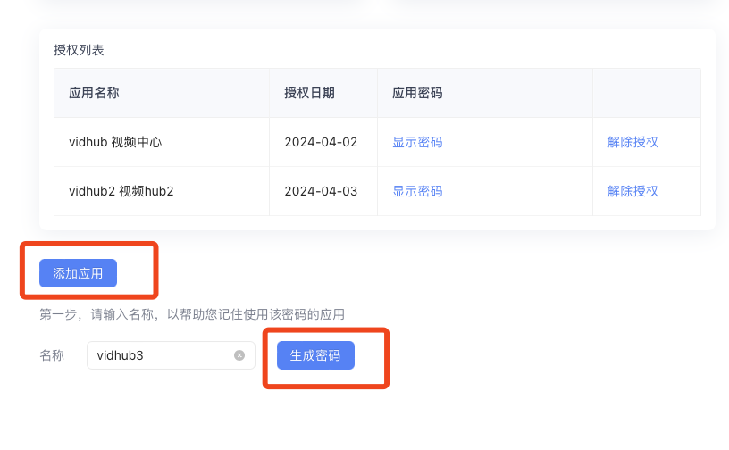 第三步:点击下面添加添加应用,名称,输入vidhub