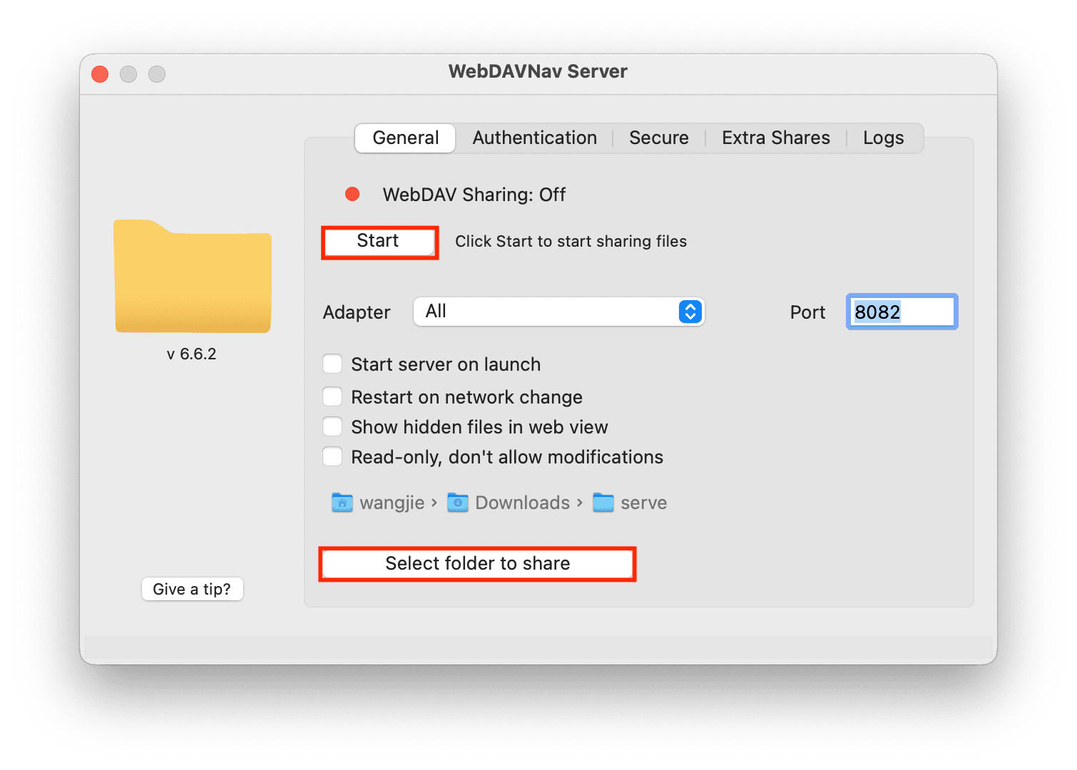- 进⼊ General 选项卡,点击 Start 以启动 WebDAV 服务器。
